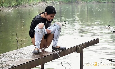 Gorgeous long legged brunette teen in demins pisses in public places