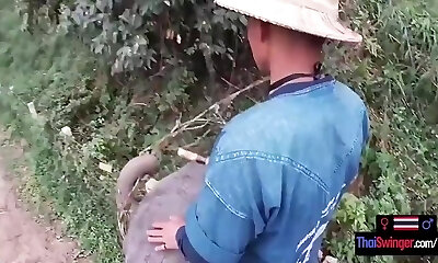 Hot couple having some fun in the forest she leans over and he fucks her from behind